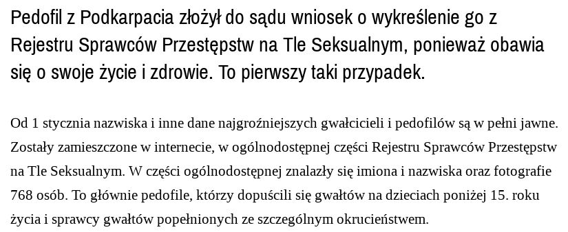 „Obawia się o swoje życie i zdrowie”. No co za biedaczyna. A nie obawiał się o życie i zdrowie 10 letniego chłopca, którego zgwałcił? Niech nie pierdoli zwyrodniały skurwiel, bo doskonale wiedział, że robi coś niezgodnego i z prawem i z normami moralnymi. A za to oprócz kar wynikających z kodeksu karnego grożą jeszcze kary „zwyczajowe”. Oby jak najszybciej ktoś jemu dobrał się do kiszki stolcowej i zrobił mu z niej jesień średniowiecza!!! Najlepiej rozgrzanym do czerwoności drutem zbrojeniowym o średnicy 20 mm. Takich chujów powinni wieszać publicznie powoli obniżając podest na którym stoi, żeby się jak najdłużej skurwiel męczył.
